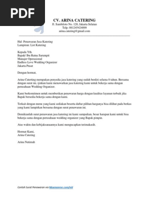 Demikianlah surat penawaran jasa katering ini kami sampaikan, besar harapan kami untuk bisa bekerja sama dengan perusahaan wedding organizer yang bapak pimpin. Surat penawaran layanan adalah salah satu jenis surat resmi yang diterbitkan oleh pelaku usaha atau perusahaan yang intinya adalah menawar. Contoh surat penawaran jasa konsultan. Surat diatas merupakan contoh surat penawaran jasa yang dikirimkan oleh pt. Oleh karena itu tak ada salahnya anda mempelajari contoh surat penawaran barang sejak sekarang. Contoh contoh dokumen penawaran proyek pengadaan dan konstruksi. Atas waktu dan kebijaksanaannya kami mengucapkan terimakasih. Kami akan memberika harga khusus jika perusahaan bapak tertarik menjalin kerjasama dengan kami. Contoh surat penawaran catering makanan. Contoh surat permohonan kerjasama jasa contoh surat penawaran jasa website toko online. Berikut adalah contoh surat penawaran jasa catering. Cara ini tidak bisa dilakukan oleh perusahaan jasa lainnya. Contoh surat penawaran produk makanan juga bisa dilihat contoh penawaran jasa catering.